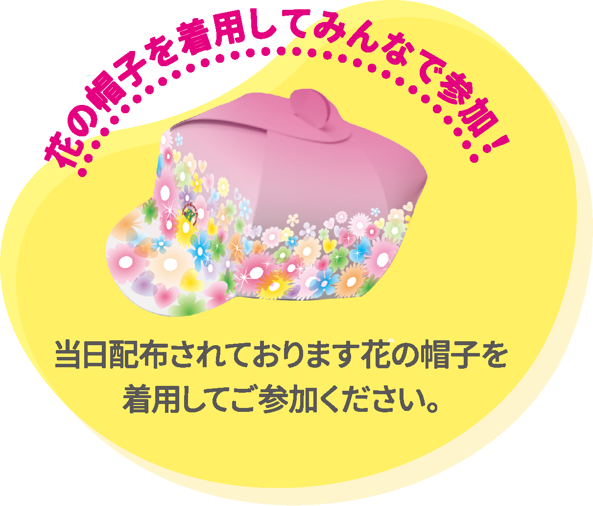2027年に50回大会を迎えるフラワーフェスティバルを盛り上げるため、みんなで手をつなぎ、ひとつの大きな花を咲かせましょう!インフォメーションセンターなどで、花柄をあしらった帽子を配布していますので、そちらを被ってご参加ください!