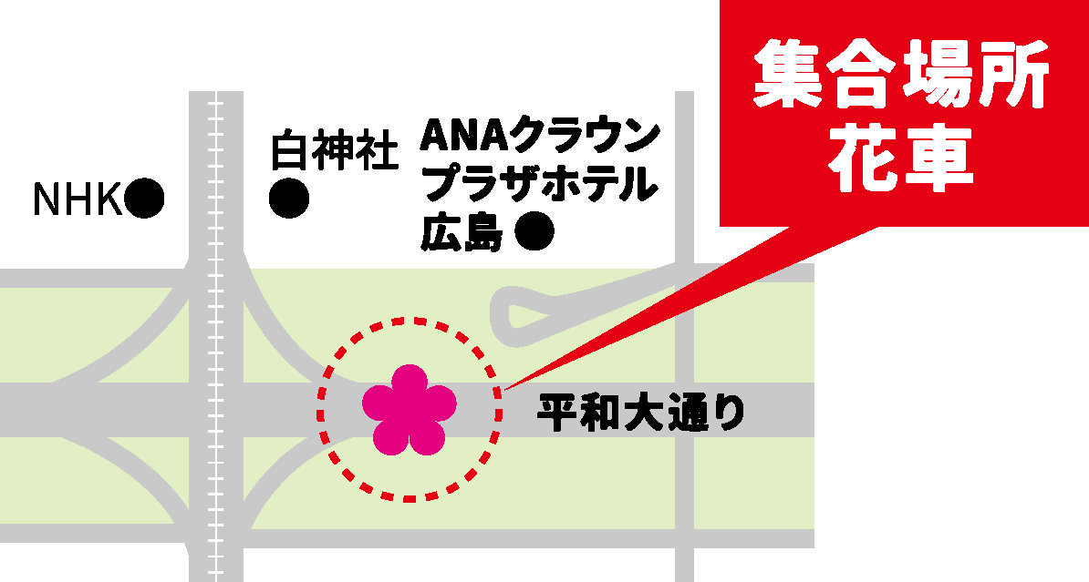 平和大通りのANAクラウンプラザホテル前に駐車している花車を目安に集まってください。
